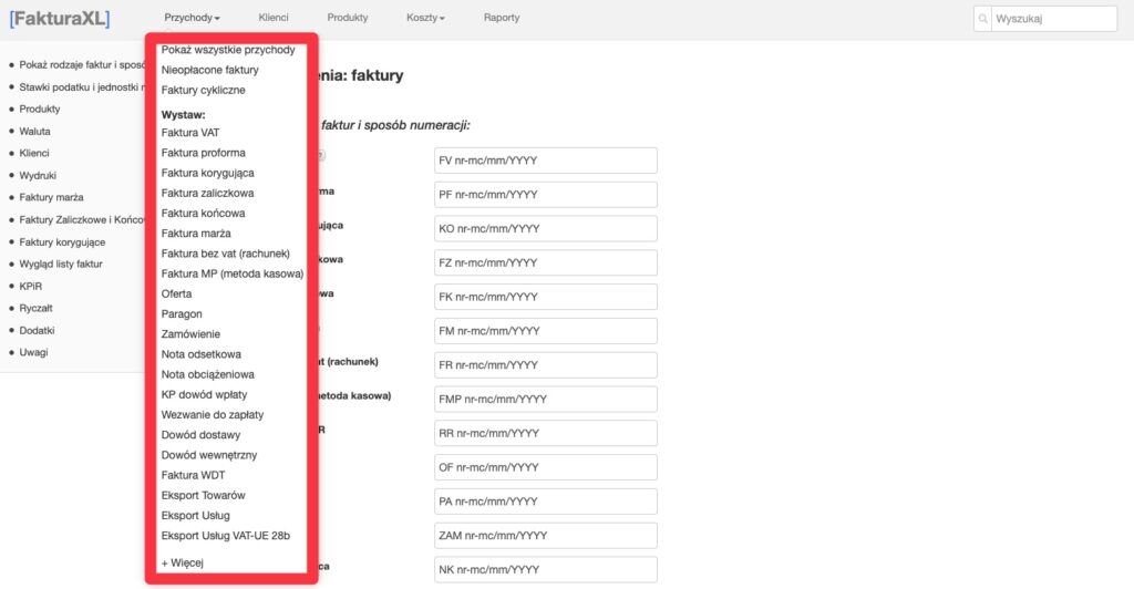 Bez konieczności kupowania oraz instalowania programów czy zatrudniania księgowych, można wystawiać ponad 35 różnego rodzaju faktur, w tym m.in. VAT, proformy, zaliczkowe czy w oparciu o mechanizm MPP, czyli związany z podzieloną płatnością. Spoglądając w panel administracyjny nie sposób zauważyć, że wybór jest całkiem spory. DOmyślnie jednak włączone są tylko podstawowe opcje z których korzysta zdecydowana większość przedsiębiorców.